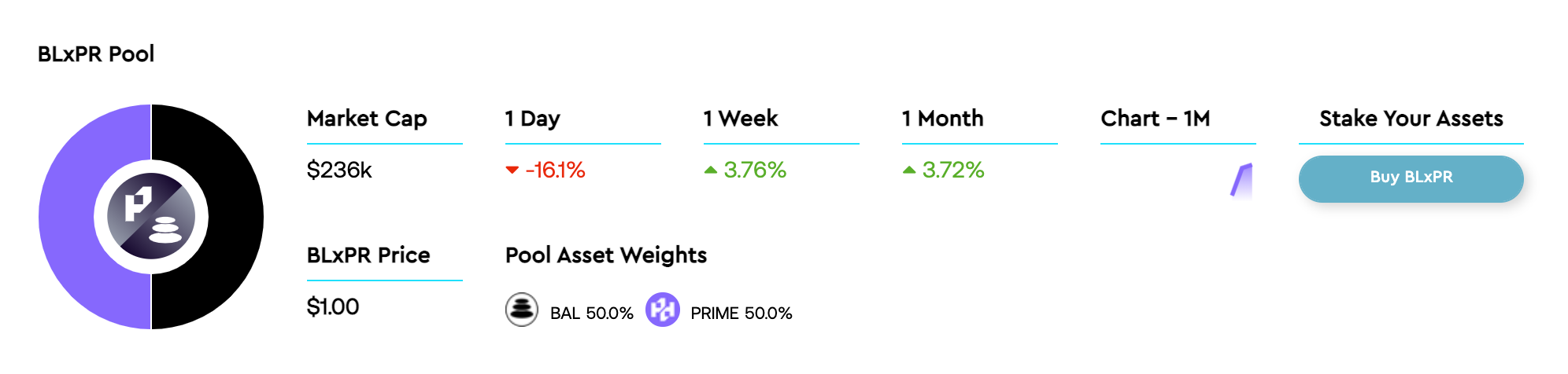 BAL x PRIME (BLxPR) is the first DAO2DAO pool running on the Balancer protocol that can be accessed through the new Prime Pools Beta dAPP.